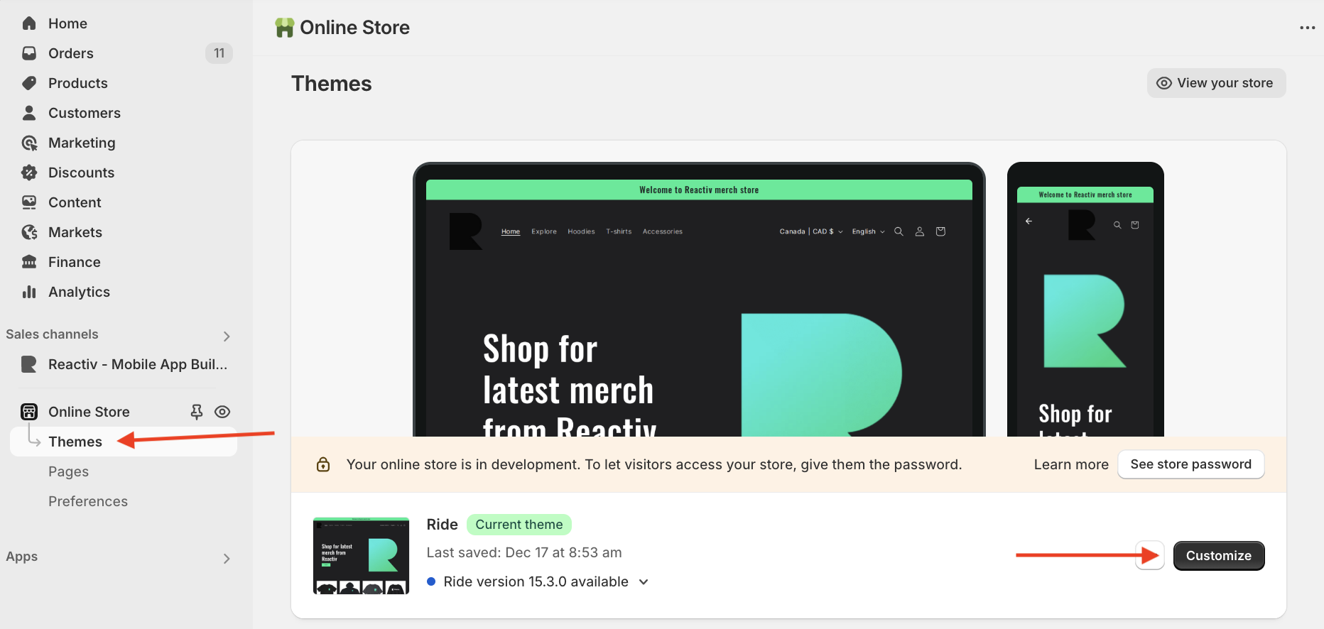 Online Store will appear in the left bar, then select Themes right under.