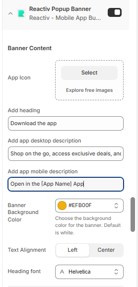 In the new window, toggle the Reactiv Popup Banner, and begin to customize your banner.