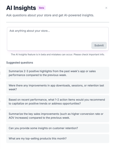 Chat directly with an AI bot to ask questions about your store and receive insights you can act on.