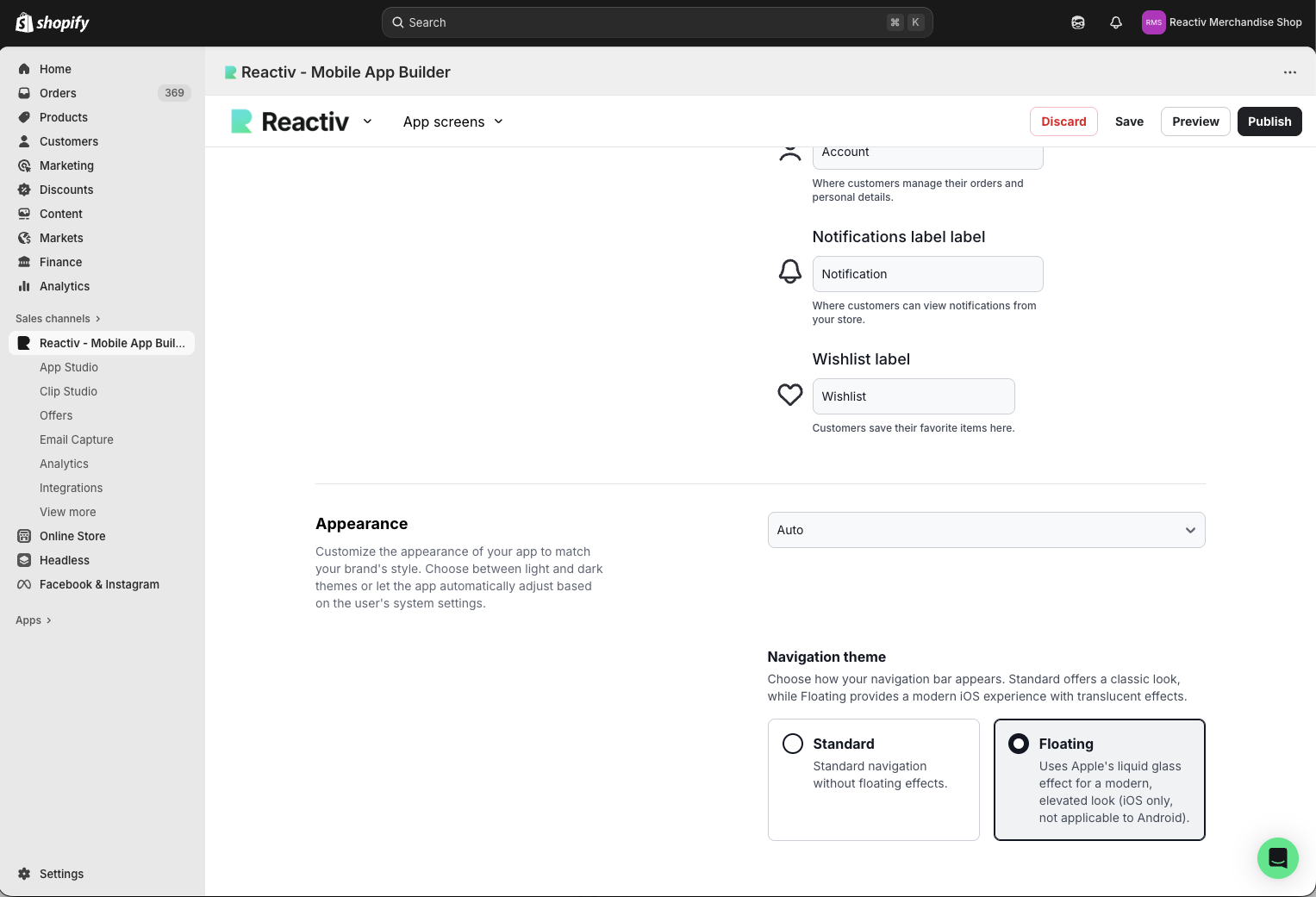 If you are a Reactiv Plus customer and have custom navigation, please contact our Support team before switching to Floating (Liquid Glass) to confirm that your existing menu customizations are supported with Liquid Glass.