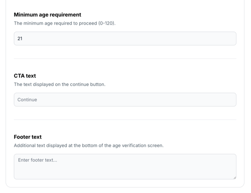 Set the minimum age a shopper must meet to proceed. For example, enter 21 if your region requires it. -