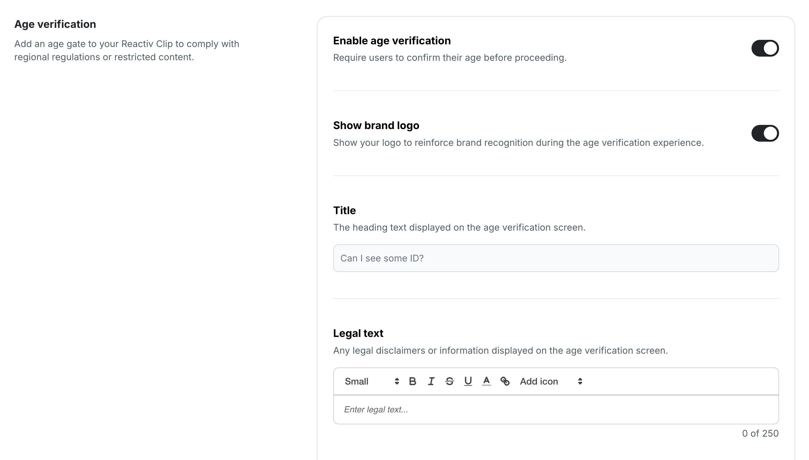 Add age verification to your Reactiv Clips to meet local laws and app store requirements. This guide shows you how to enable the feature and customize the verification screen.