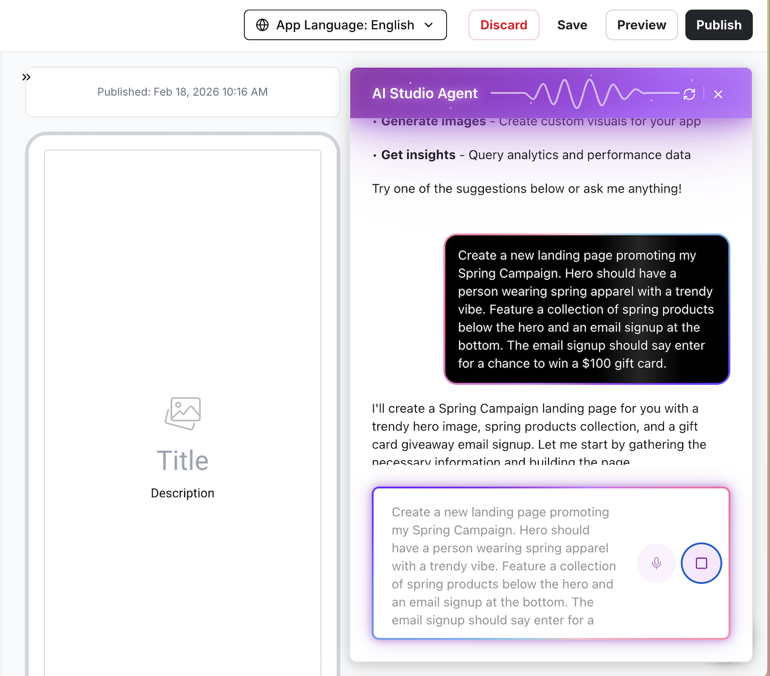 Anything you can build or modify in the dashboard, the AI Studio Agent can handle for you through prompts, helping you move faster and streamline your workflow.