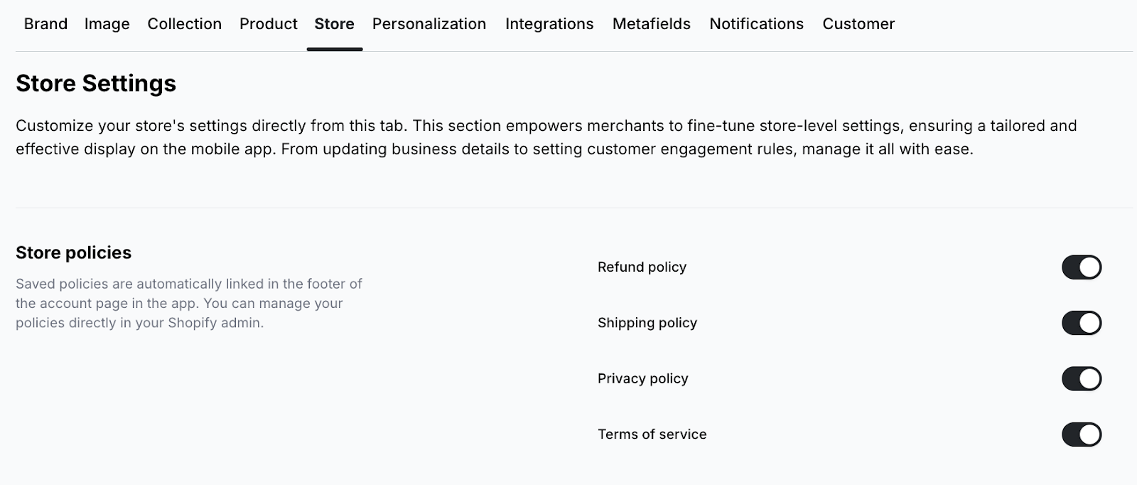 Edit your store’s app-level settings, like which policies to show in the mobile app.