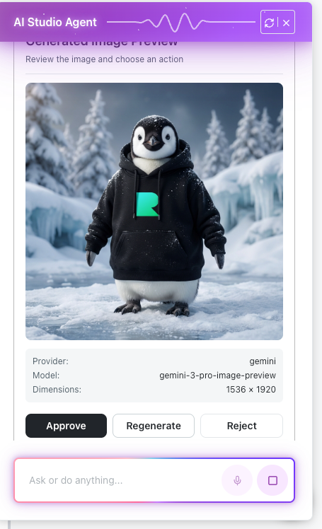 - Reject – Discard the image and try again. The AI builder will still allow you to refine the original prompt if you wish to do so.