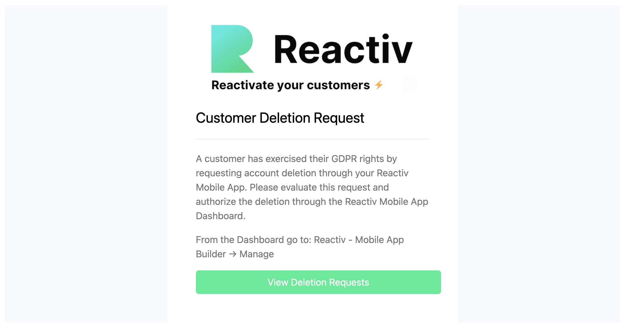 Once a customer has requested to Delete their Account, an automatic email will be sent to the Shopify Store email. The Subject Line will be; Store Name: Customer Deletion Request and it will look like the below;