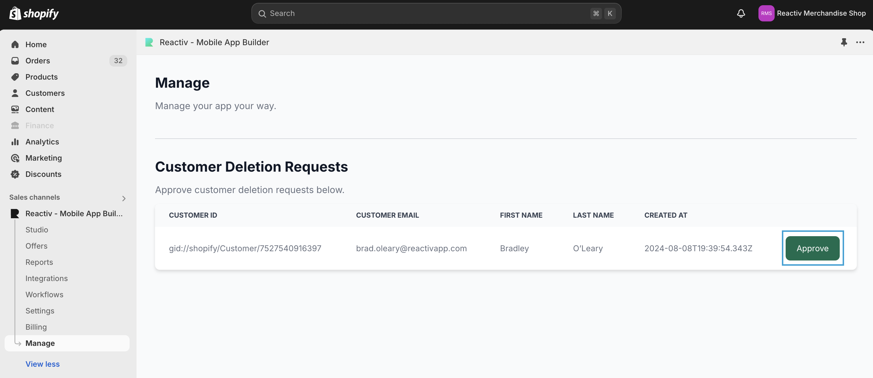 Navigate to Shopify > Reactiv - Mobile App Builder > Manage