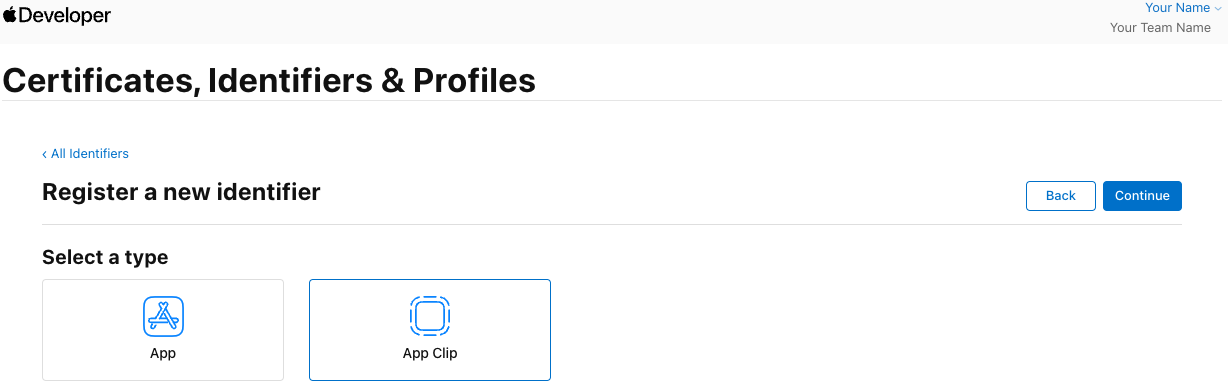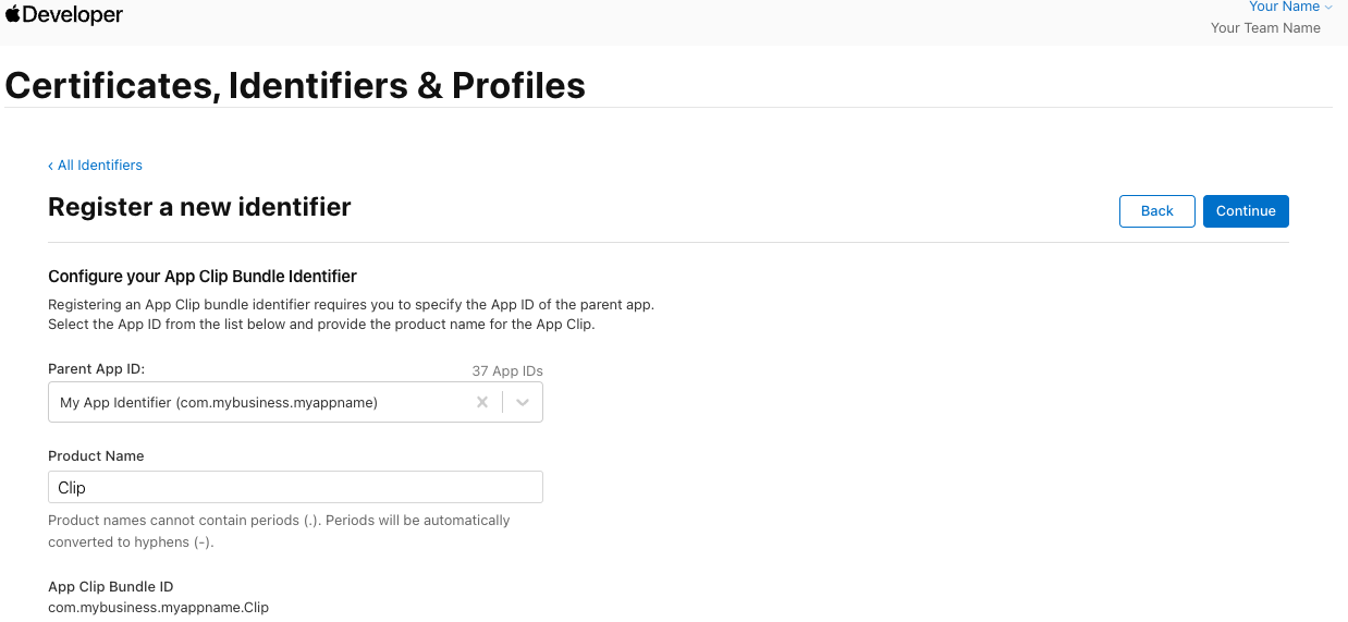 • Under Parent App ID, select the Identifier created in a. Create an App Group. For Product Name, enter “Clip”. Click Continue.