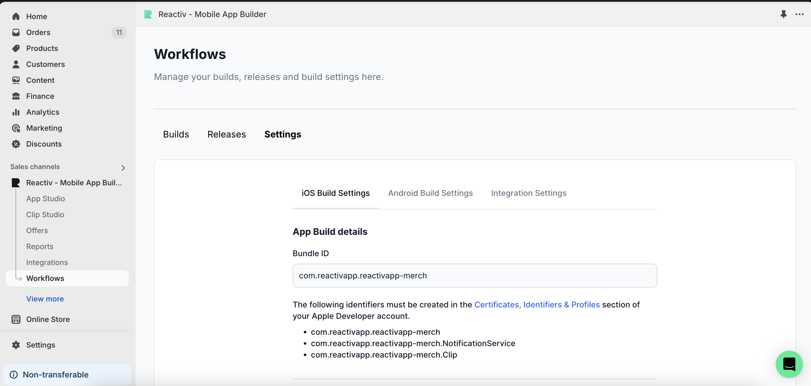 On the Reactiv Dashboard, navigate to the Settings tab under Workflows and select the iOS Build Settings. Ensure your App Identifier and your App Clip Identifier match the dashboard.