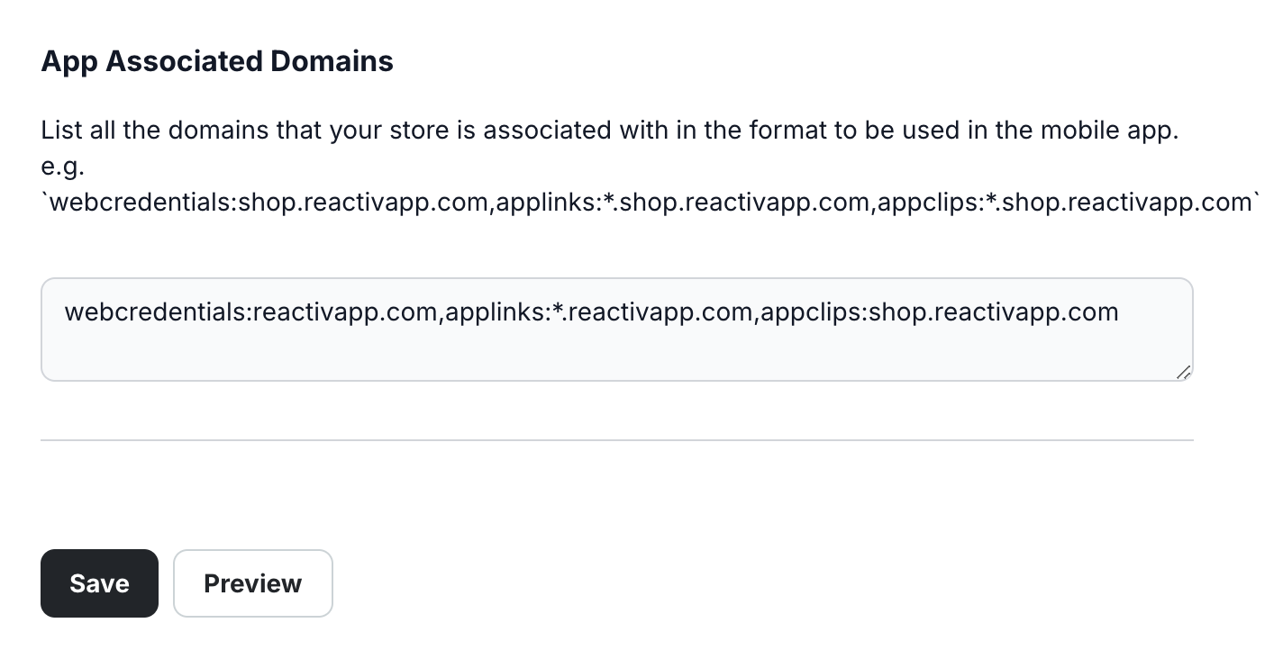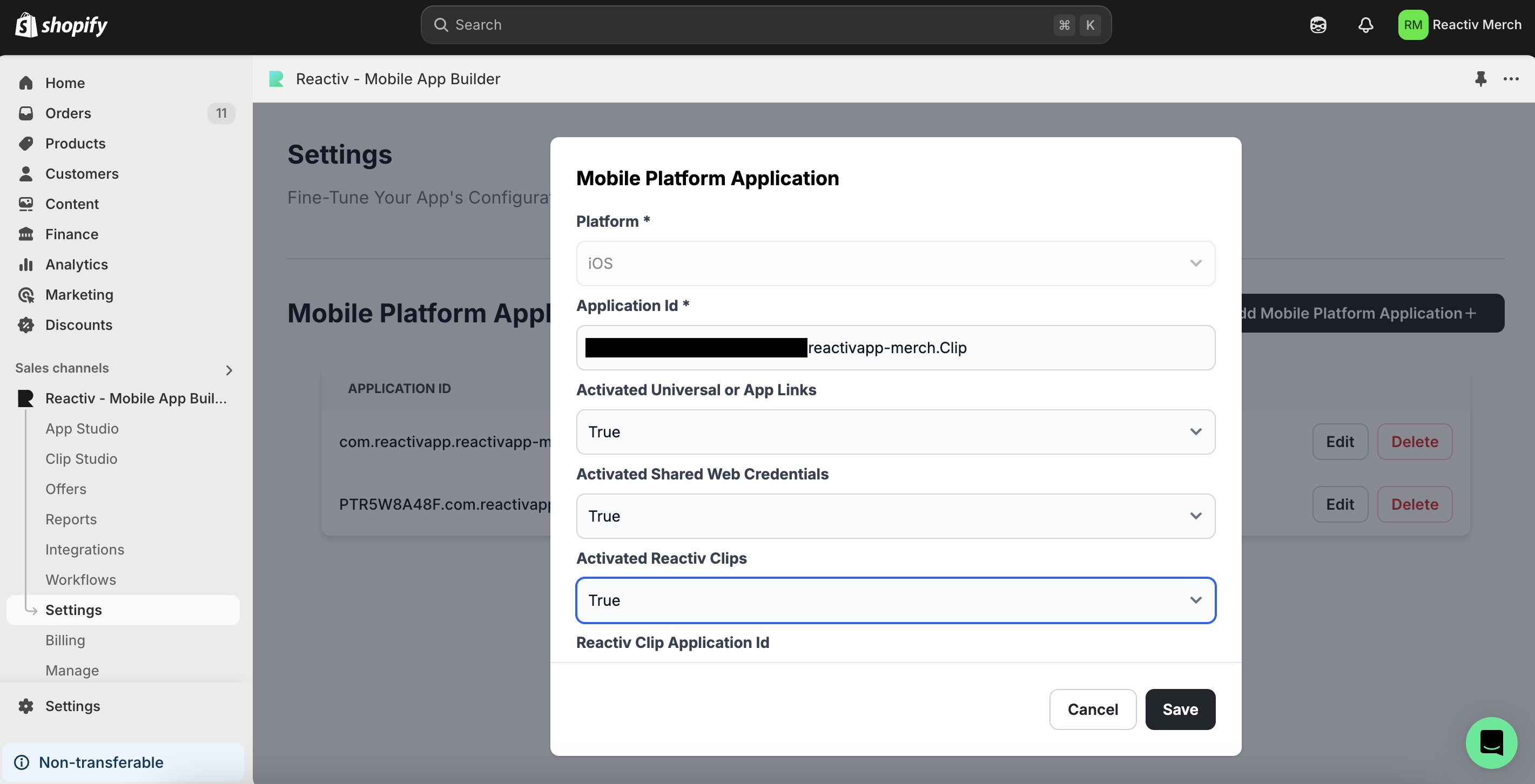 On the Reactiv Dashboard, navigate to Settings and click the App Mobile Platform Application button. Select iOS, enter your Application ID and App Clip Identifier, select True for the other dropdowns and Save.