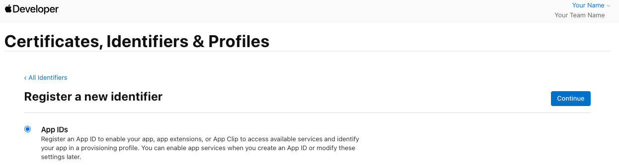 On the next page, select App IDs, then Continue.