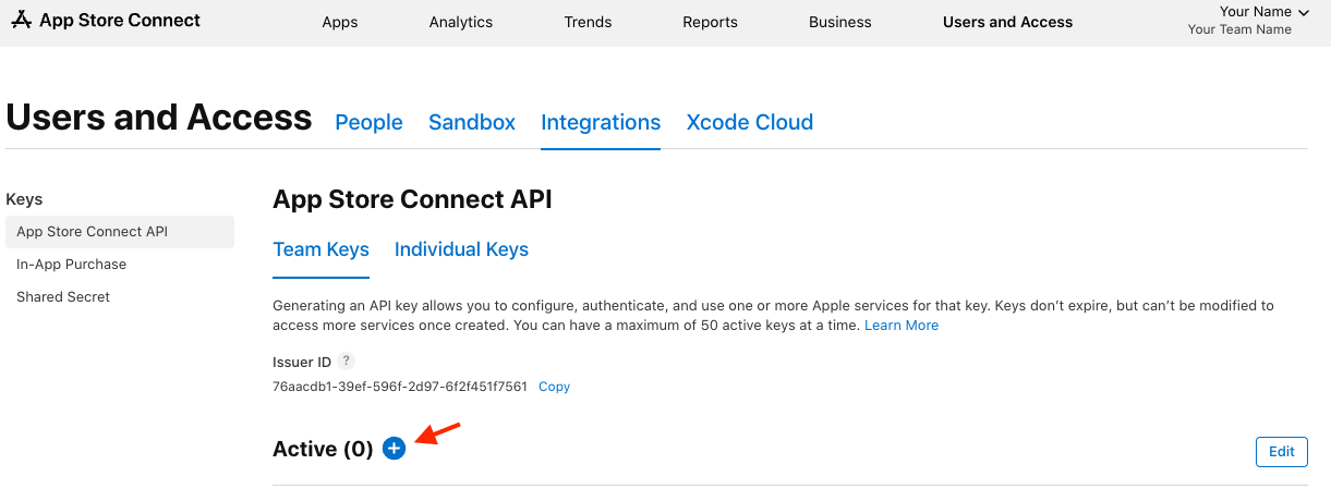 From the Users and Access page in your App Store Connect account, navigate to the Integrations tab and select App Store Connect API in the sidebar. Under Team Keys, click on “+”.