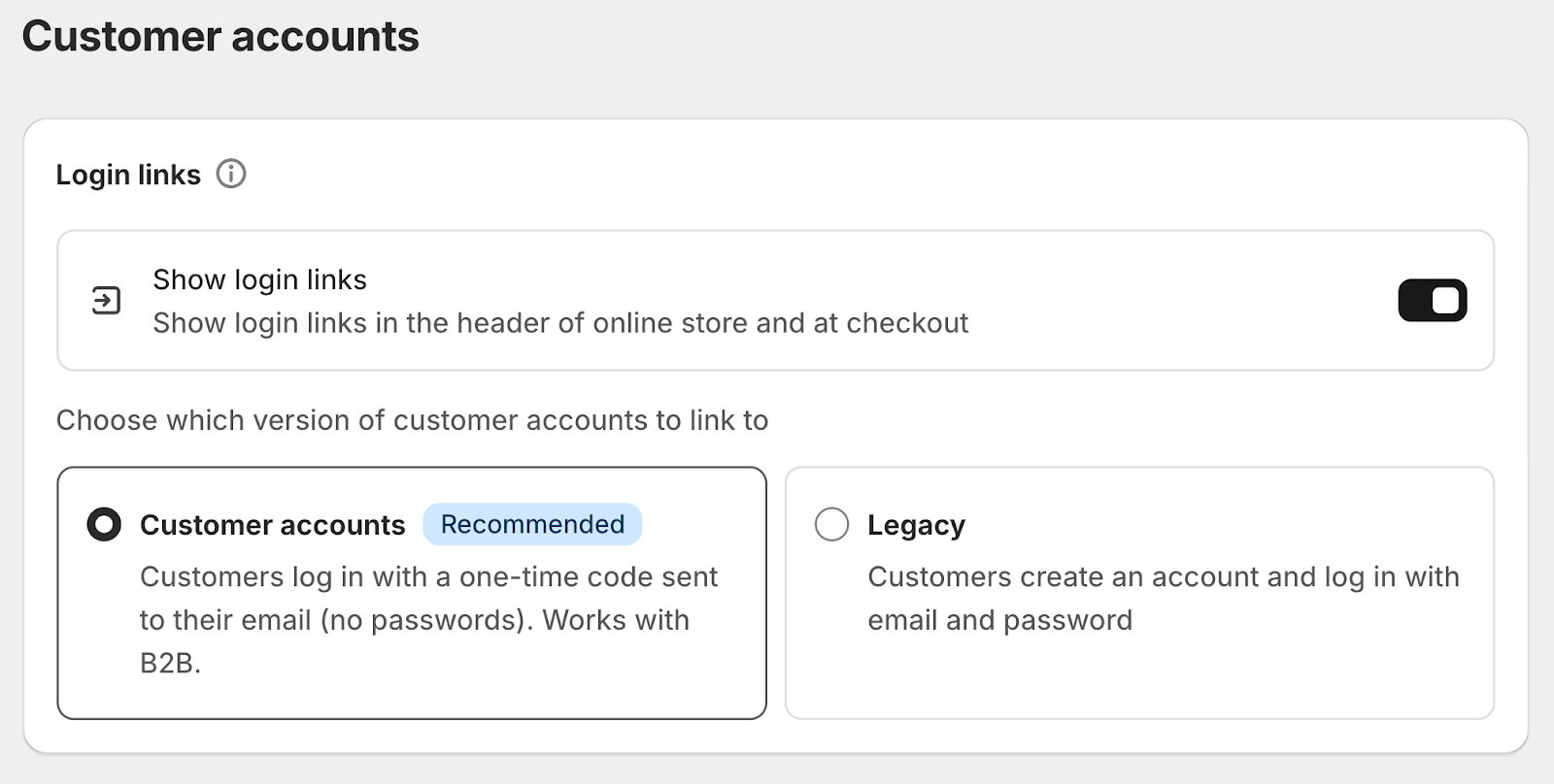 In your Shopify Admin, go to Settings > Customer accounts.