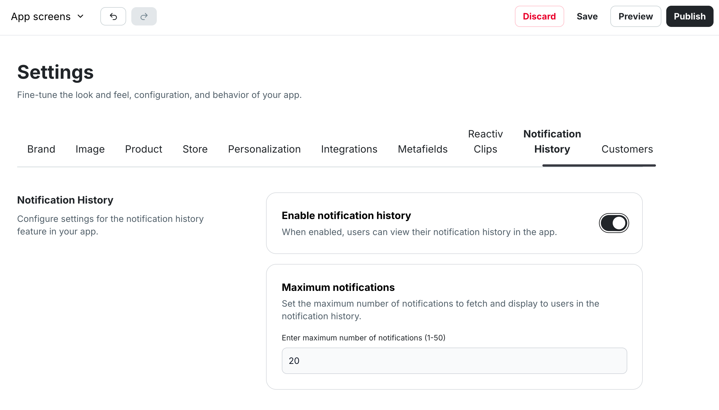 Enable Notification History to let shoppers view past push notifications inside your mobile app. This guide shows you how to turn it on, set a display limit, and ensure your Klaviyo integration is correctly configured.