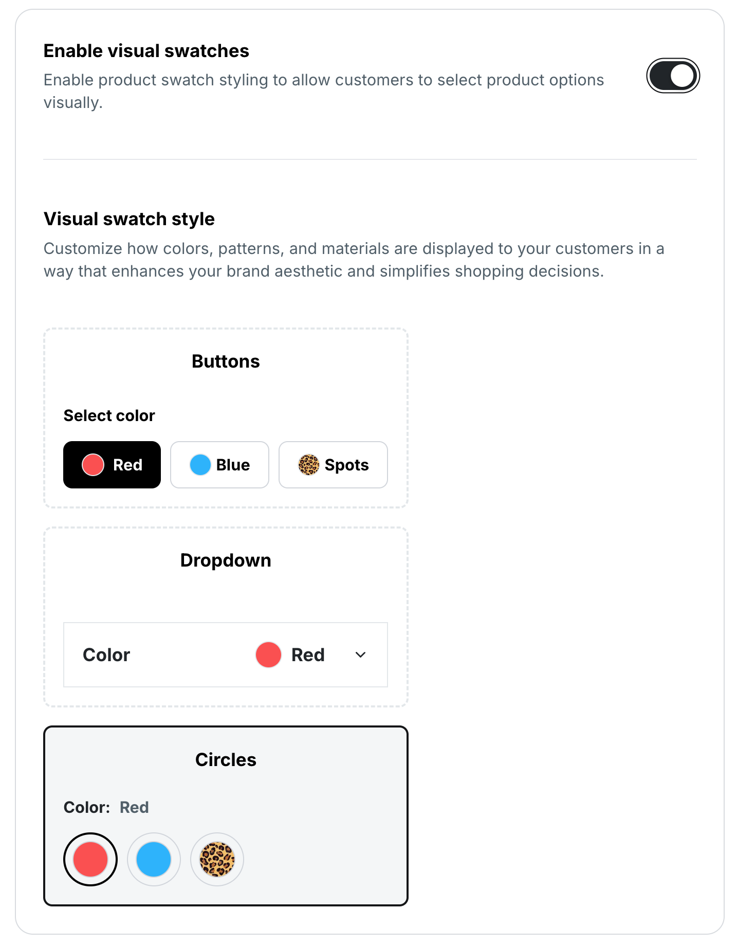 If your variants use visual representations (like colors or patterns), toggle Visual Swatches on.