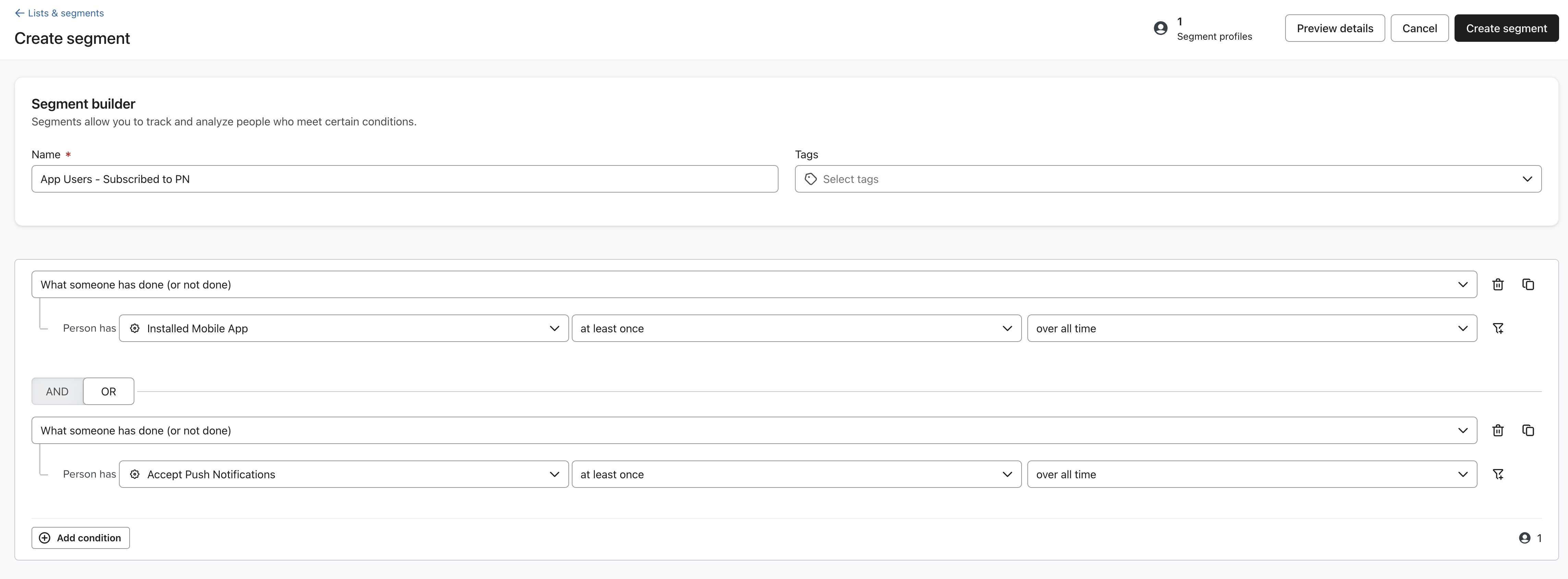 ⭐️ Reactiv Tip: Create a Segment using the following criteria to segment all App Users that have opted-in to push notifications