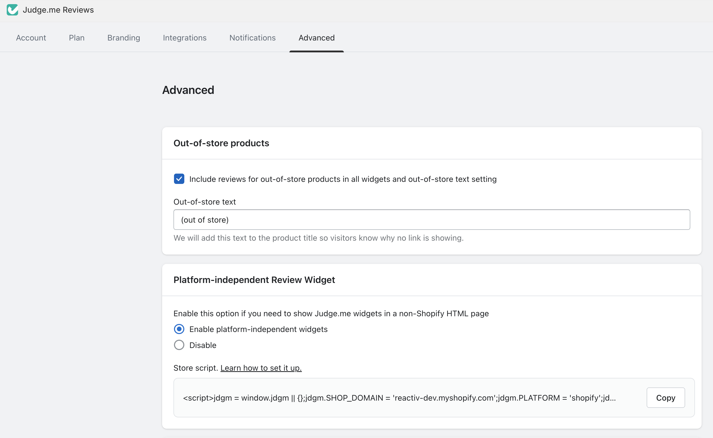 Reviews Not Displaying: Confirm that the integration was successfully updated and check for any necessary configurations within the JudgeMe dashboard. You may need to ensure that you are allowing Judge.me to be read by the mobile app. To do this, navigate to Judge.me Reviews in your Shopify Admin > General Settings > Advanced > Platform-independent Review Widget, and make sure this setting is Enabled.