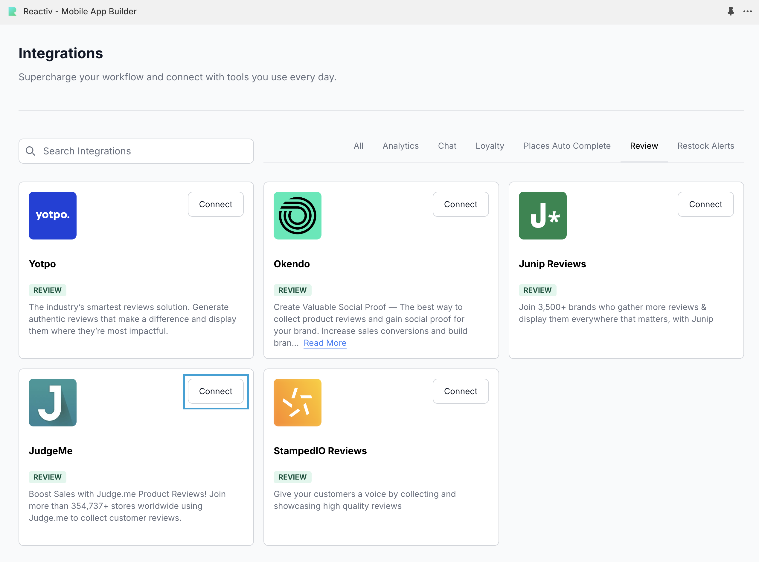 This guide will help you integrate JudgeMe for reviews with your Reactiv Mobile App. JudgeMe is a powerful tool for collecting and showcasing customer reviews to enhance user trust and engagement within your app.