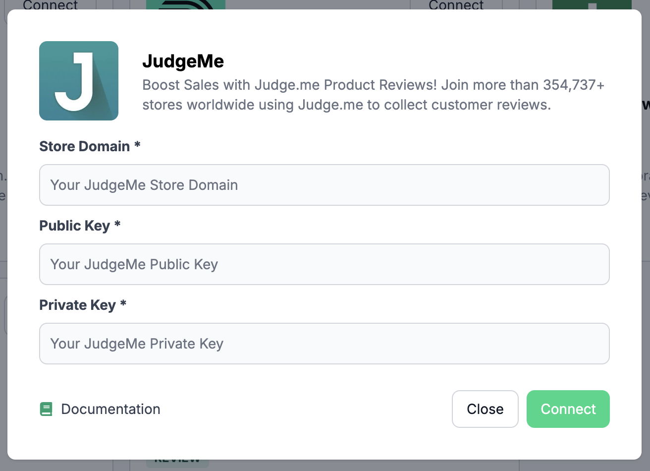 In the JudgeMe integration popup, you will see a fields for the Store Domain, Publis Key & Private Key.