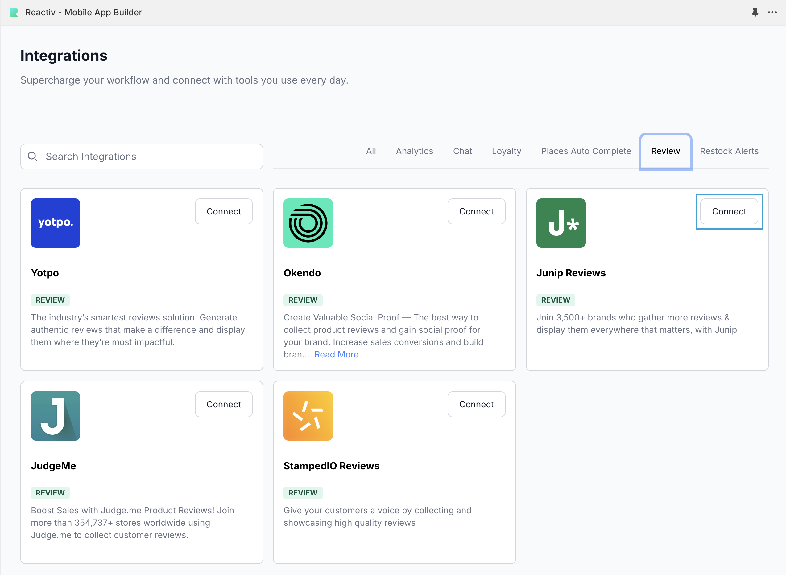 Once saved, Junip Reviews will be connected to Reactiv.