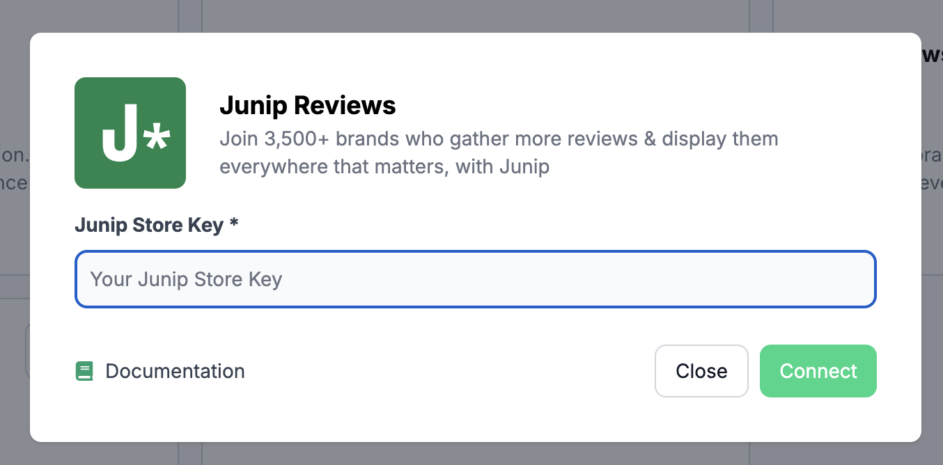 In the Junip Reviews integration popup, you will see a field for the Store Key.