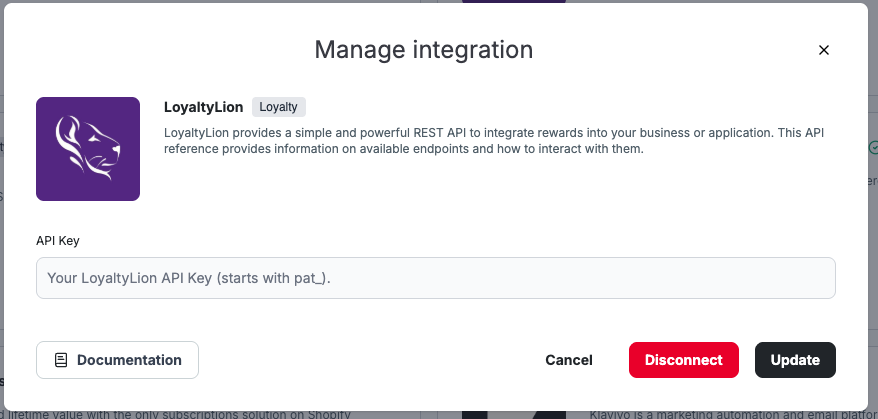 After enabling the integration, you will be prompted to enter your Loyalty Lion API credentials.