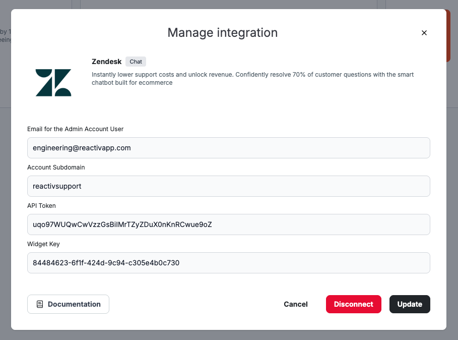 In the Zendesk integration popup, you will see a fields for the Email for the Admin Account User, Account Subdomain, API Token & Widget Key