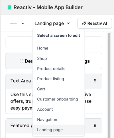 In the Reactiv App Studio, select Landing Page from the screen dropdown.