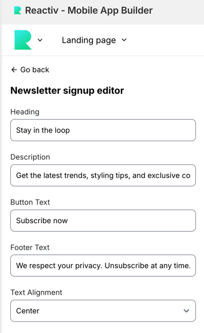Once enabled, the Newsletter Signup section will be available for use in your app screens.