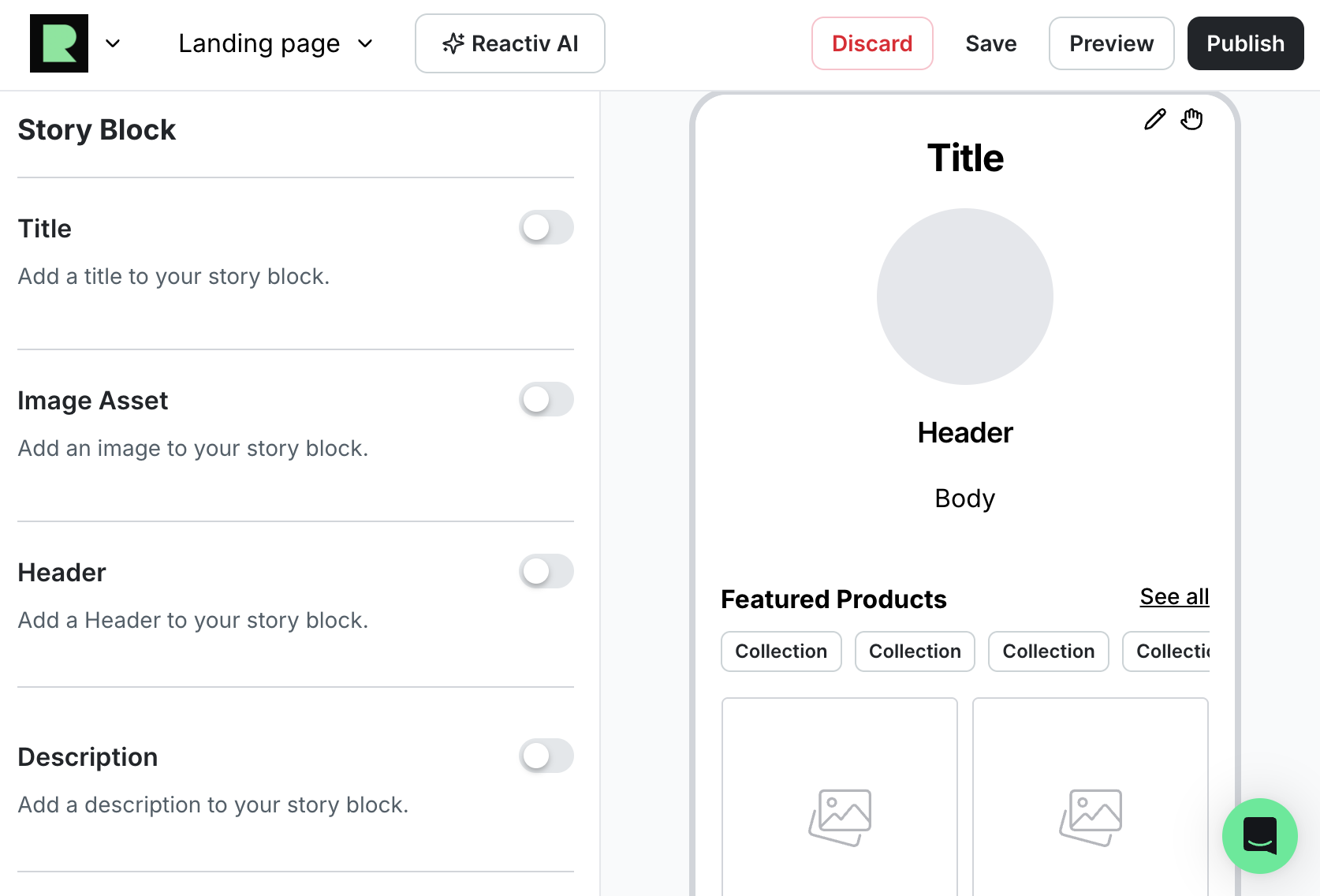 In this guide, you’ll learn how to create and customize Landing Pages in your Reactiv mobile app or Reactiv Clip. Landing Pages are focused, high-conversion screens designed to engage shoppers from a specific source—like ads, emails, or social media—and guide them toward a single goal, such as making a purchase or exploring a collection.