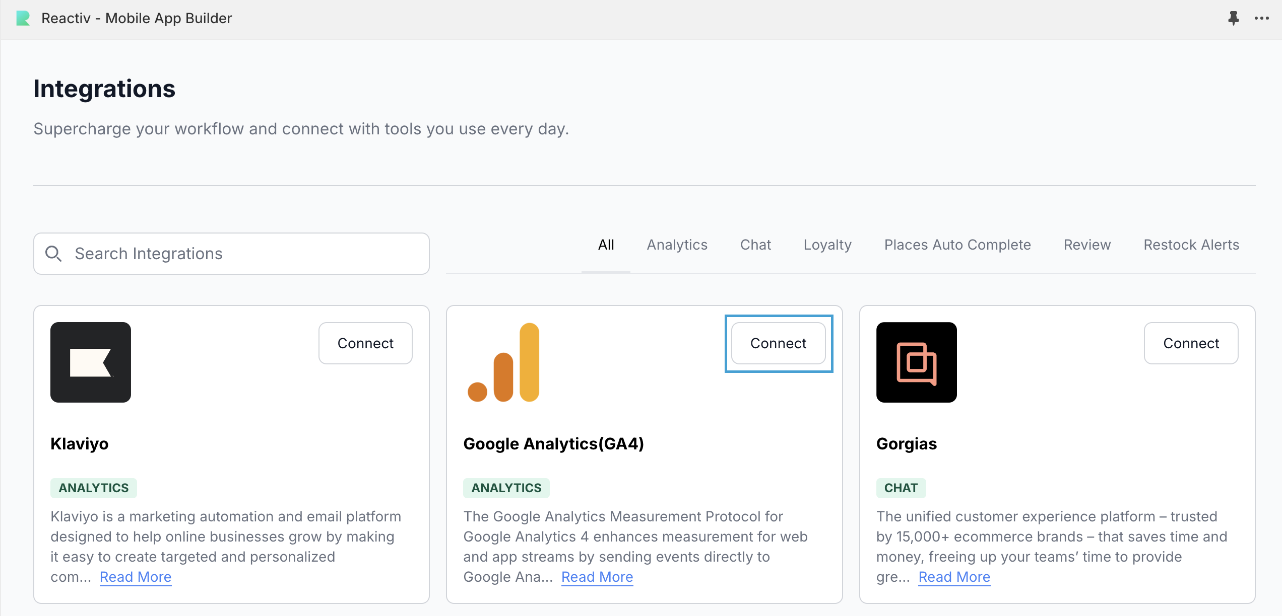 Integrating Google Analytics (GA4) with your Reactiv mobile app allows you to track and analyze user interactions effectively. Reactiv's Firebase integration empowers you to leverage Firebase Cloud Messaging. This guide will help you set up and configure these integrations for your Reactiv app.