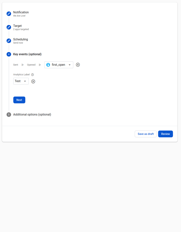 (Optional) Select a Key Event or Conversion Event metric to track engagement from the push notification. If not required, click Next.