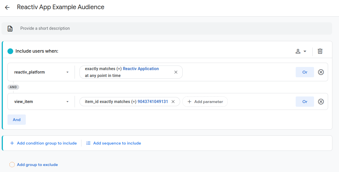From Add new condition, choose Events > view_item. This selects users who triggered a view_item event.