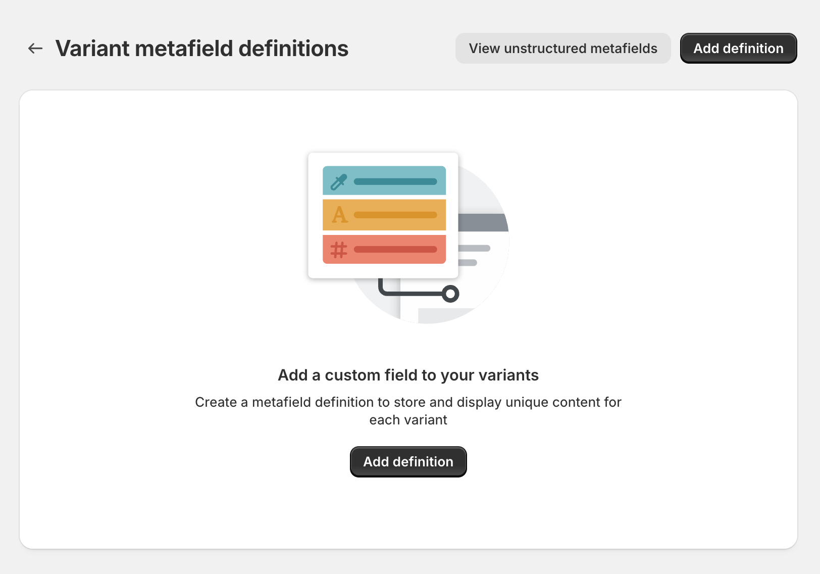 In your Shopify admin, go to Settings > Custom data > Variants.