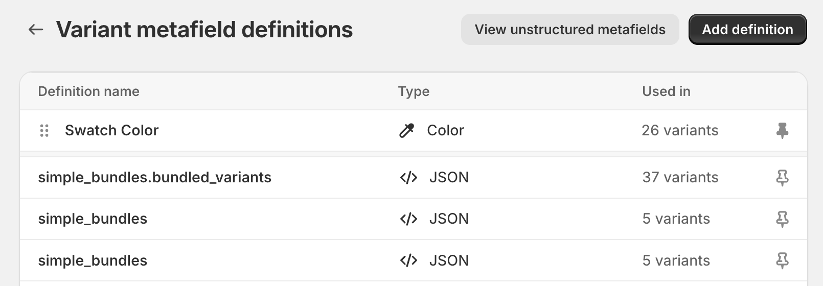 In Admin Settings > Custom data > Variants > View unstructured metafields, you’ll see three metafields: