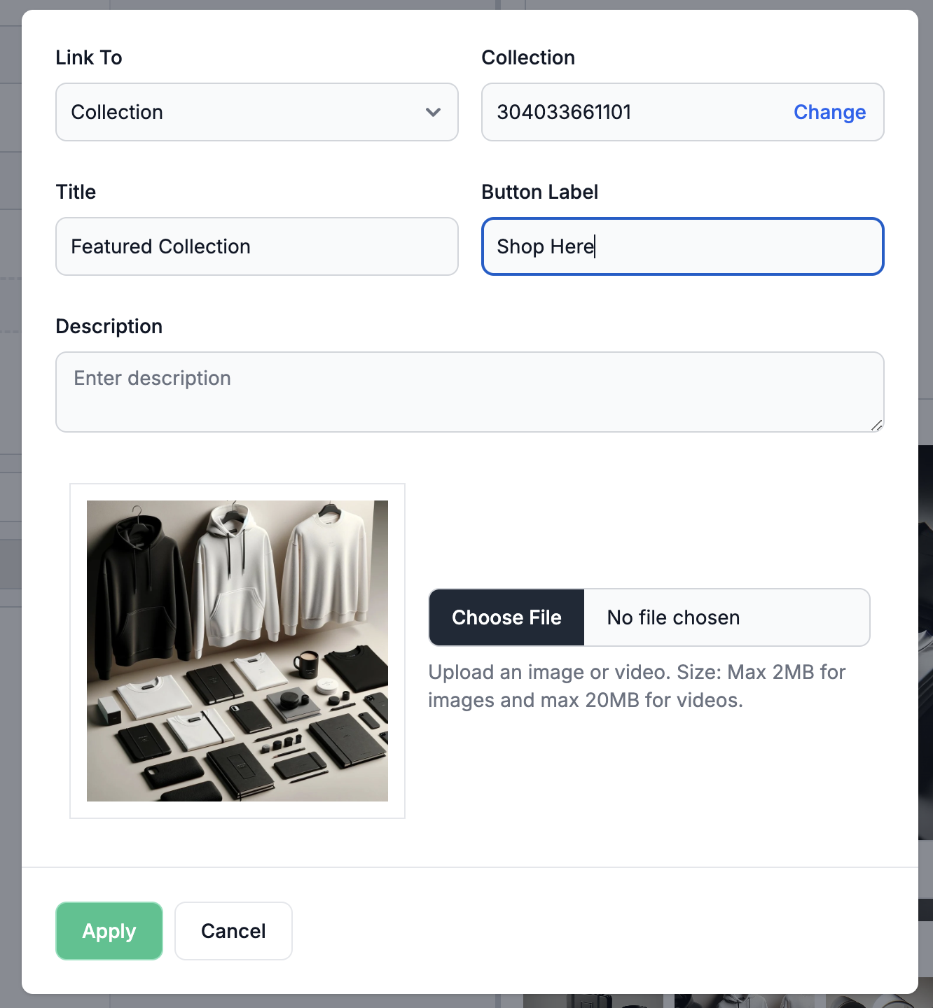 Add Collectionbutton, then select as many collections you want to display in the home page.The featured image from you collection will automatically be pulled which you can change if needed.