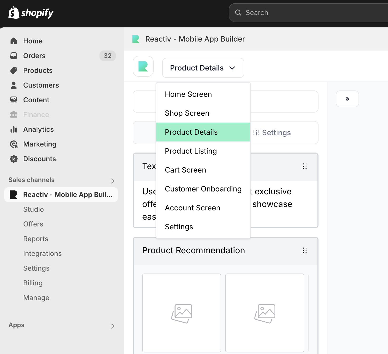 Open Reactiv Dashboard by going to Sales channels > Reactiv - Mobile App Builder.