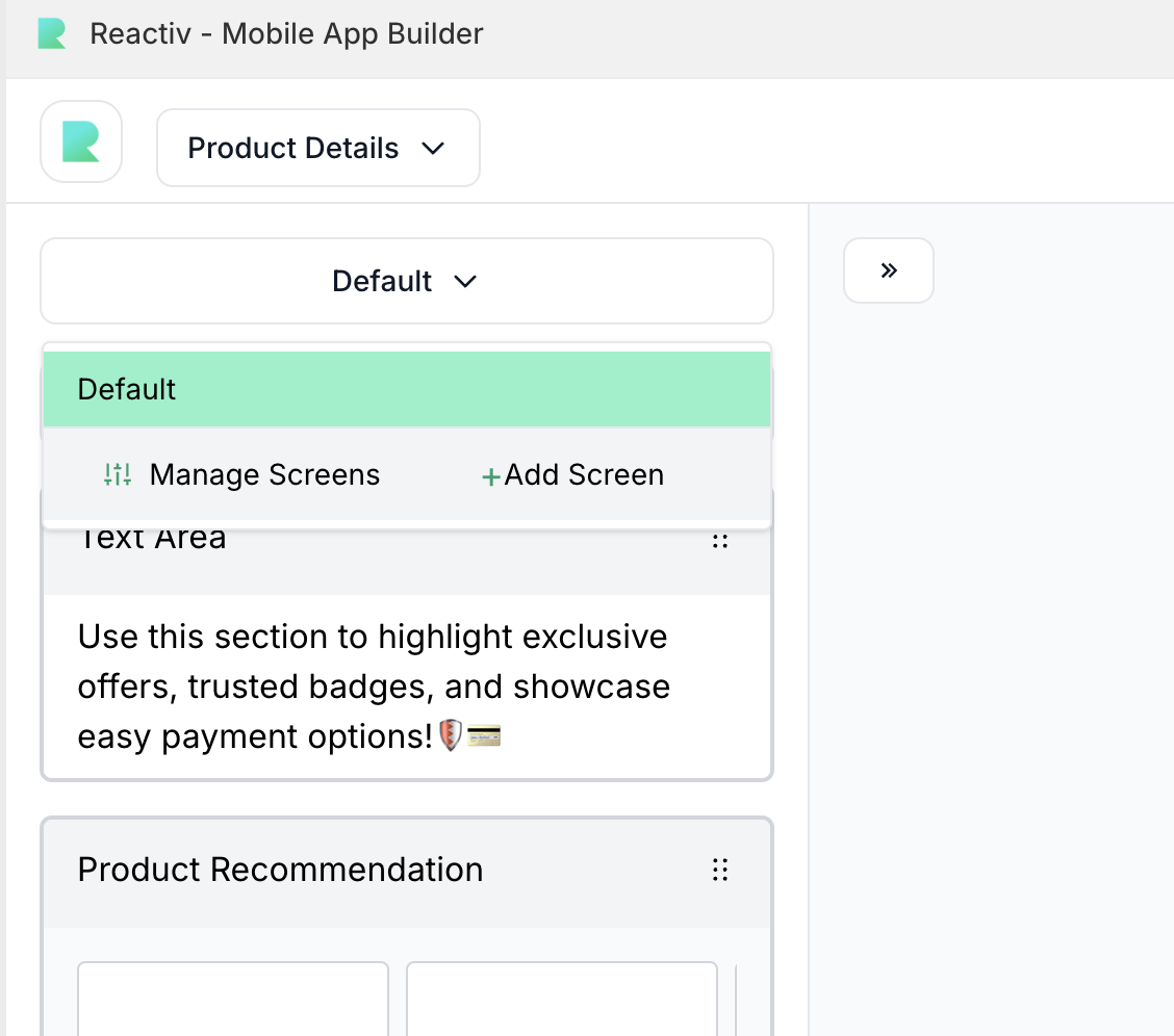 To create an additional PDP template, click on the Default drop down and select +Add Screen.