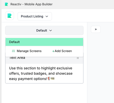 To create an additional PLP template, click on the Default drop down and select +Add Screen.