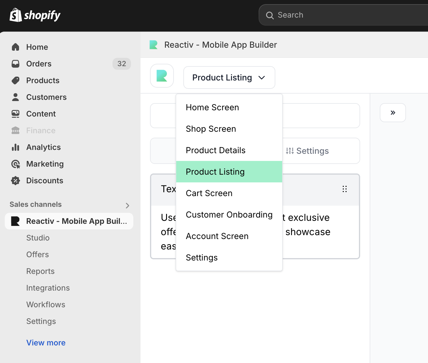 Open Reactiv Dashboard by going to Sales channels > Reactiv - Mobile App Builder.