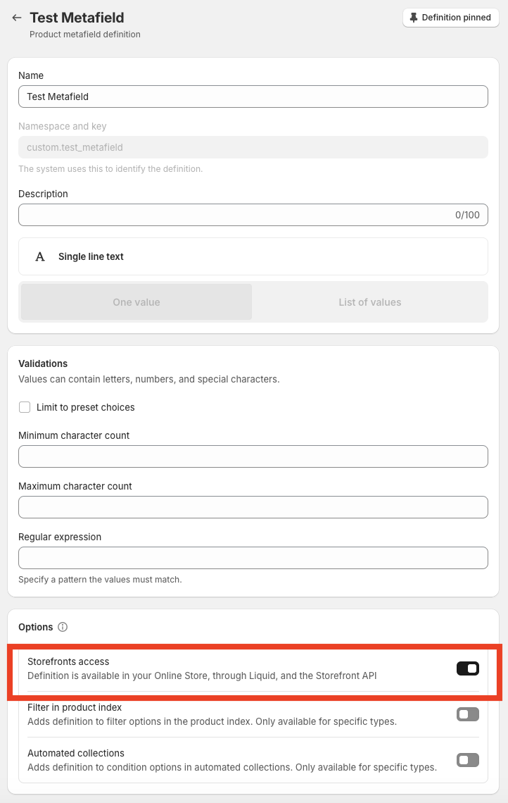 Select the metafield definition you want to expose to storefronts and enable storefront access.