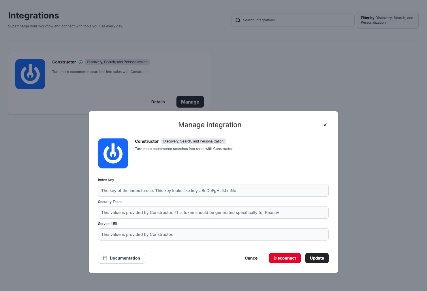 Check Constructor Credentials: Go to Integrations in the left-hand navigation and confirm your Index Key, Security Token, and Service URL match Constructor’s values.