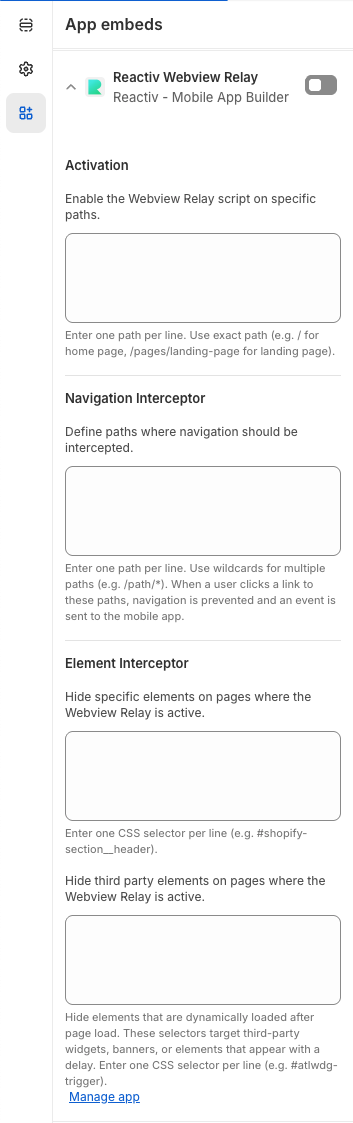 Scroll through the list of available app embeds and locate Reactiv Webview Relay.